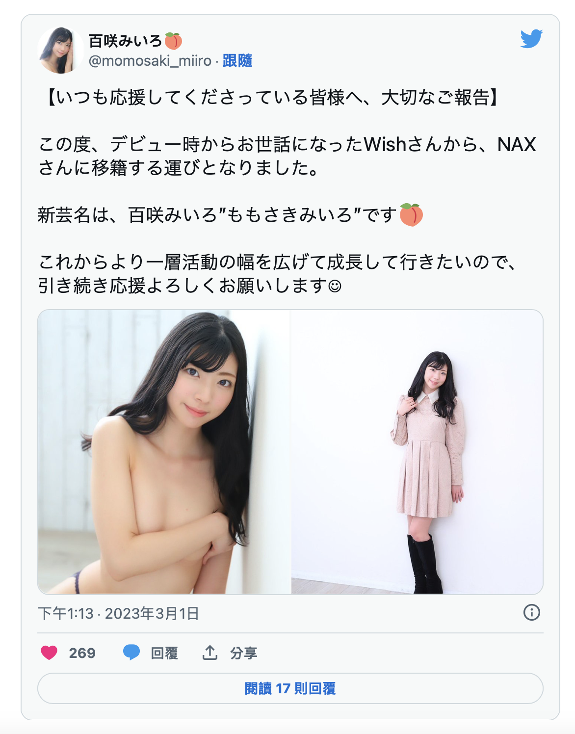 接下来我们看这位百咲みいろ(百咲未色),twitter上写了,她是从原来的事务所Wish跳槽去了NAX,艺名也从七咲みいろ(七咲未色)改为百咲みいろ(百咲未色),以我所了解的AV界,这个移籍应该没有搞到两间经纪公司翻脸,所以百咲みいろ(百咲未色)得以保留绝大多数的艺名,接下来就看看这位自称中学就想当AV女优、被喻为「最强逆封杀(就是本人比封面好看太多)」的女优如何用新的名字在业界立足:
