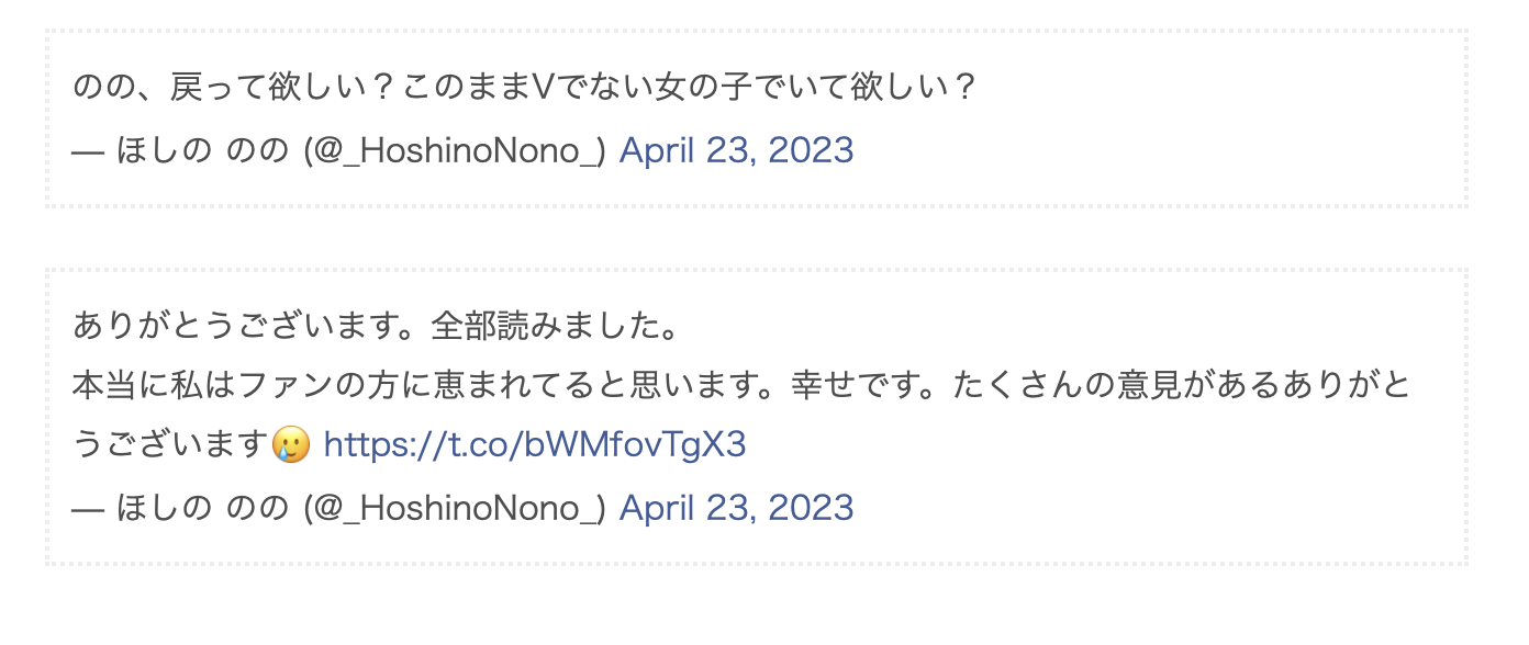 「大家希望我回去拍AV吗?(のの、戻って欲しい?このままVでない女の子でいて欲しい?)」