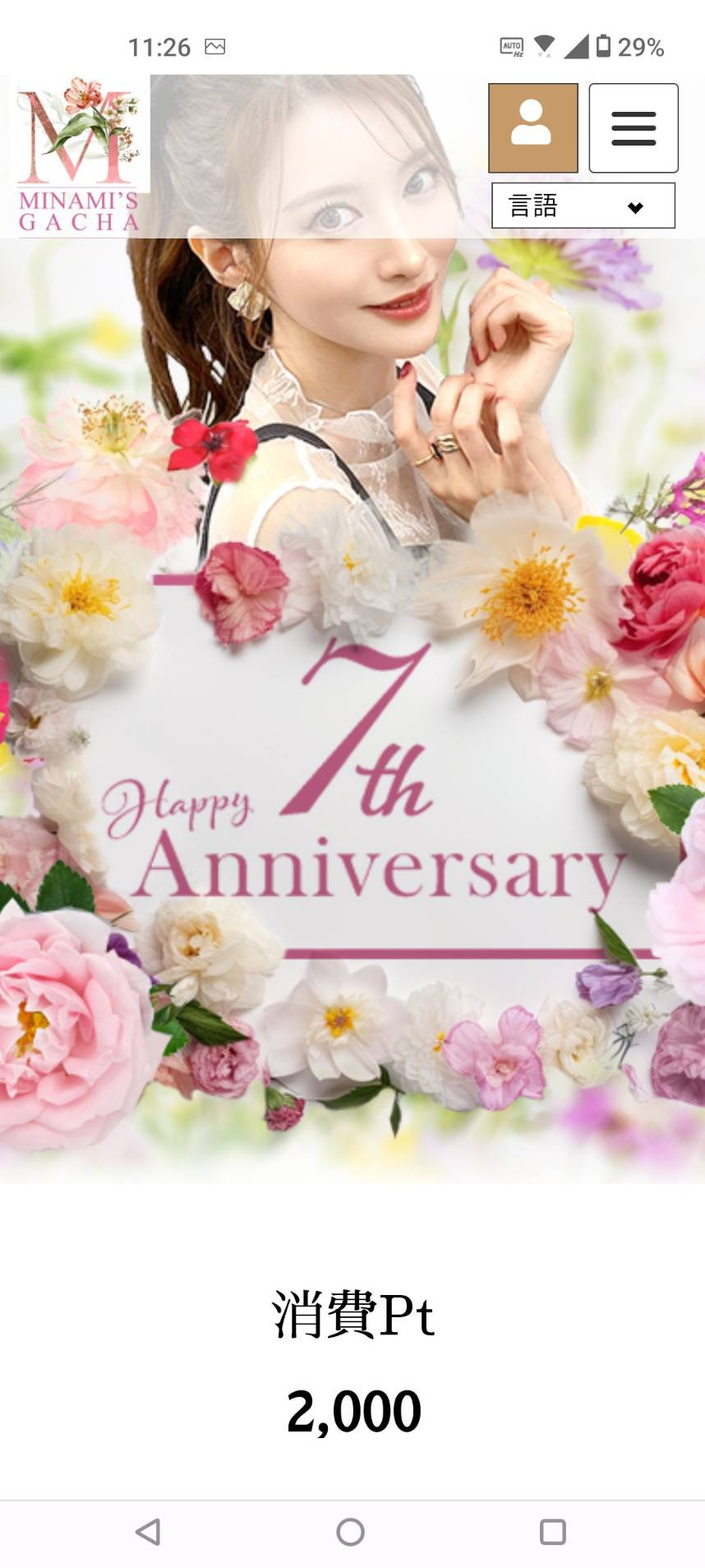 答案是她举办了「7周年纪念ガチャ」的活动,简单说就是线上抽抽乐啦,总共1000抽,每一抽2000日币(折合台币约$450),可以得到的奖项如下: