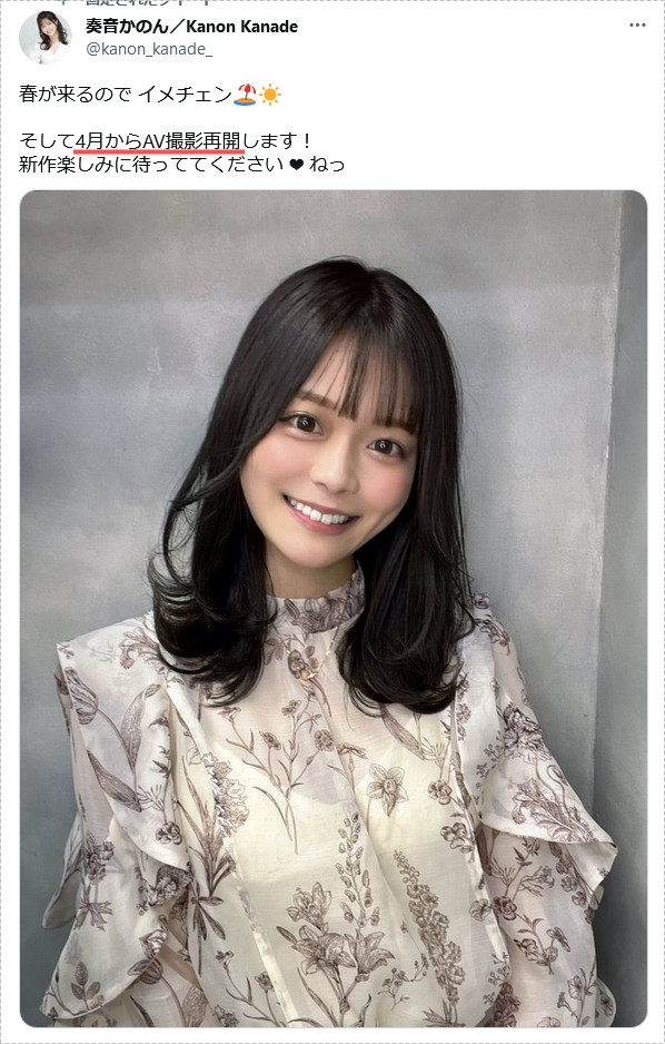 这位曾经是市场最好发片机器的女优在移籍到现在事务所「NAX」后没多久就暂停了发片作业,而在4月底的时候,她在X(Twitter)告诉大家在相隔一年后她已经重回摄影棚拍摄AV了,以新法规定的发片时间来看作品应该要上架接受预约了: