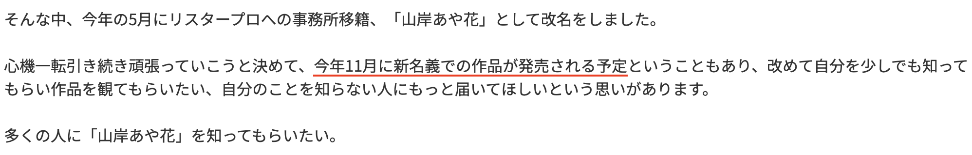 什么?你问我为什么知道却又讲了出来?这个让我来和大家解释一下:一般而言事务所是很愿意和业者说各种情报的,但有个前提,就是你不能抢在片商之前公布ー那这次为什么可以说?那是因为山岸あや花(山岸绮花)在募资平台自己讲了,新片将会11月的时候发售,然后ー