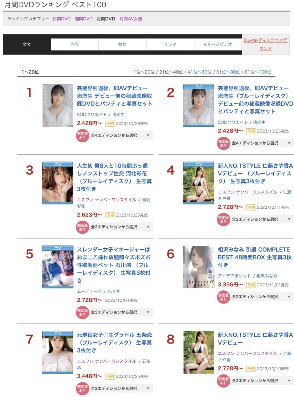 这次的销售排行榜很重要,因为是三上悠亜引退后的第一次销售排行榜,我们都知道花河北彩很卖、片商S1有很多新鲜的肉体然后SOD Star组成了艺能人军团,究竟~谁是2023年9月的销售排行榜冠军呢?