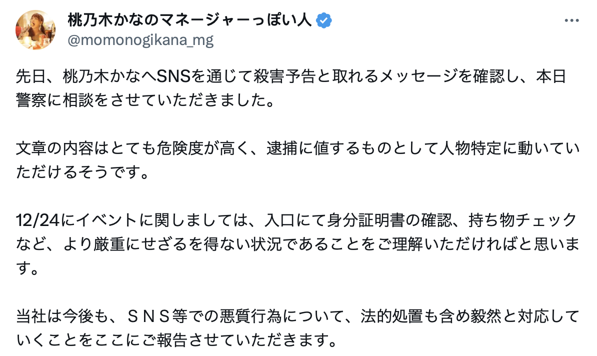 以「神可爱」著称、也是大家最期待在明年TRE台北国际成人展登场的「桃乃木かな(桃乃木香奈)」在社群收到了死亡威胁:根据经纪人的说法,在收到恐吓的私讯后他们就报警了,警方研究完对方发来的讯息后认为「非常危险」,为了保护桃乃木的人身安全,嫌犯有逮捕的必要: