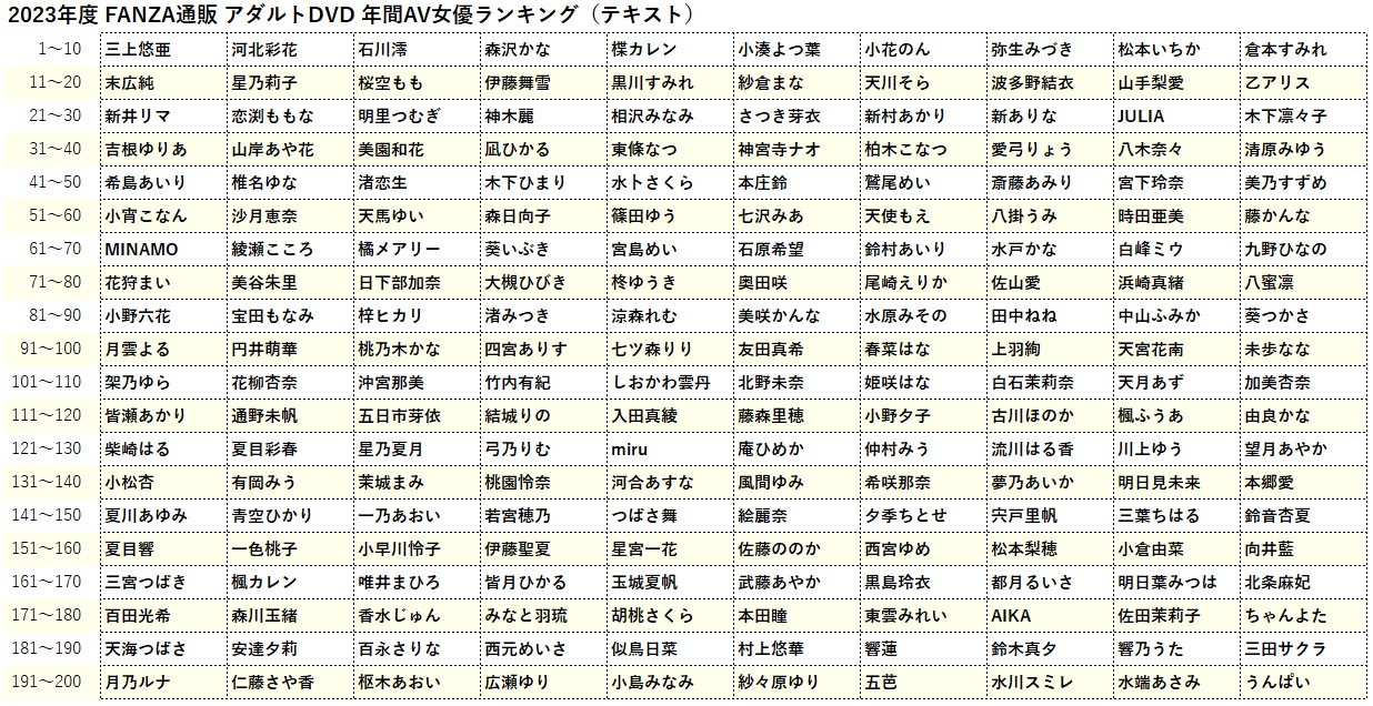 好,接下来看排名:去年在FANZA上作品卖最多出去不是别人,正是引退的三上悠亜ー这也很正常啦,毕竟她的引退企划提前四个月展开而且她片子一支接一支发,就是要大家把片子通通收回去,而看起来很多人也真的这么做了ー所以昨天在介绍作品销售排行榜的时候相信大家就知道销量冠军宝座肯定是她的囊中物,毕竟2023年销售前20名有7支她的作品: