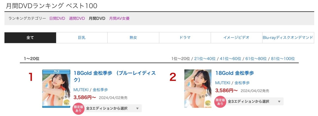 但就算这样,她还是拿下了AV女优累积销售排行榜的第二,仅次于金松季歩:为什么呢?我想可能是她这个月的作品「世界最高峰の爱人河北彩花が骨の髄までご奉仕してくれる最高の3日间」蓝光和DVD版双双入榜,三支作品加起来的总销量超过了其他女优,只输给了金松季歩〜