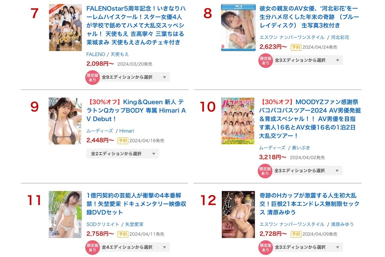 然后长浜的写真作品「ALL NUDE」还拿下了第六,从出道以来她真的是气势无法挡,就连艺能人也不见得是她的对手ー没错,在长浜之下的就是SOD STAR艺能人女优「矢野爱茉」的新作1亿円契约の芸能人が冲撃の4本番解禁!:虽然第2支作品就输给了长浜みつり(长滨蜜璃)难免会被觉得退烧有点快,不过作品销售这块能讨论的事情很多,包括矢野的主场并不是在FANZA、包括作品打折的%数也会影响影迷购买的意愿,我是觉得还好啦,现在还不是担心她的时候〜