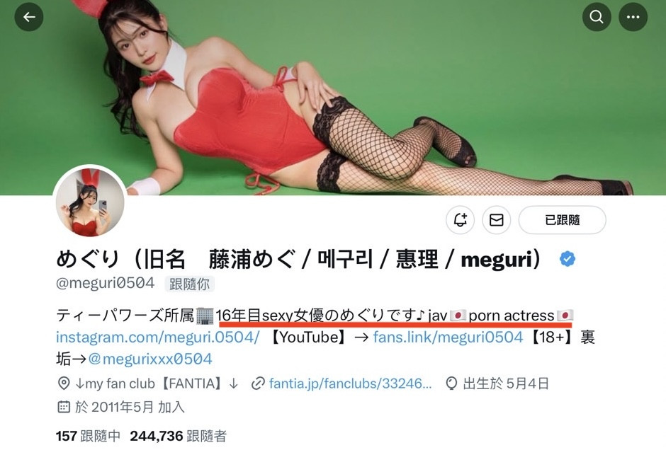 可能有人会以为めぐり(惠理)引退了,这个とある撮影指的未必是拍A片,但你只要到她的X(https://twitter.com/meguri0504)就知道她从来没说自己引退了,在自我介绍她是写说「16年目sexy女优のめぐりです(第16年的AV女优惠理)」,意思就是虽然她很久没拍片了但仍然是「现役」,她不是忘了改,而是从来不认为自己离开惹: