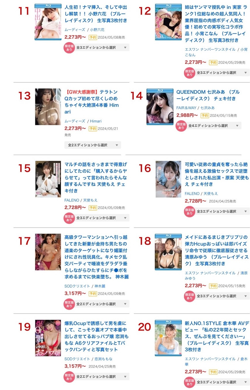 很快地,一年又过了三分之一,大家应该都感受到新人蜂涌而出的力道了,接着,我们马上来看上个月、2024年4月AV界的销售排行榜是谁称霸?