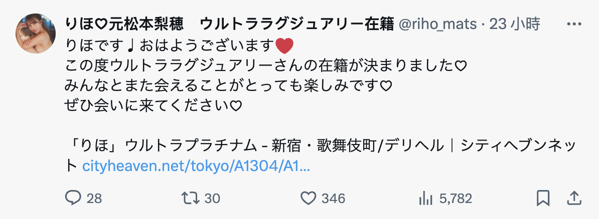在宣布退休之后曾来台做过很多活动的前气象主播「松本梨穂(松本梨穗)」迅速在x上开了小号(https://x.com/riho_mats),当时我还在想开这小号要干嘛,结果不久前她公布了答案: