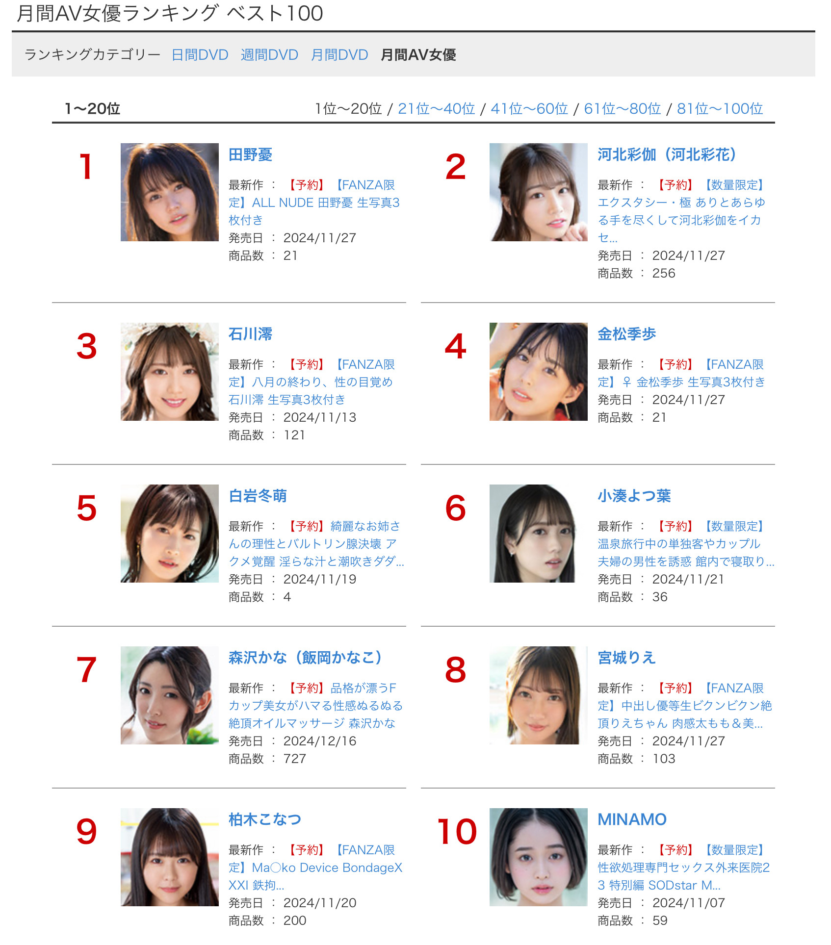 那里出大事?是Fanza(DMM)才刚公布的10月实体片销售排行榜,以往这个排行榜就是「河北彩伽」的天下,不管是作品销售排行的「月间DVD」又或者是销售量累积的「月间AV女优」排行榜她一定会拿一个冠军,但这次她什么都没有....