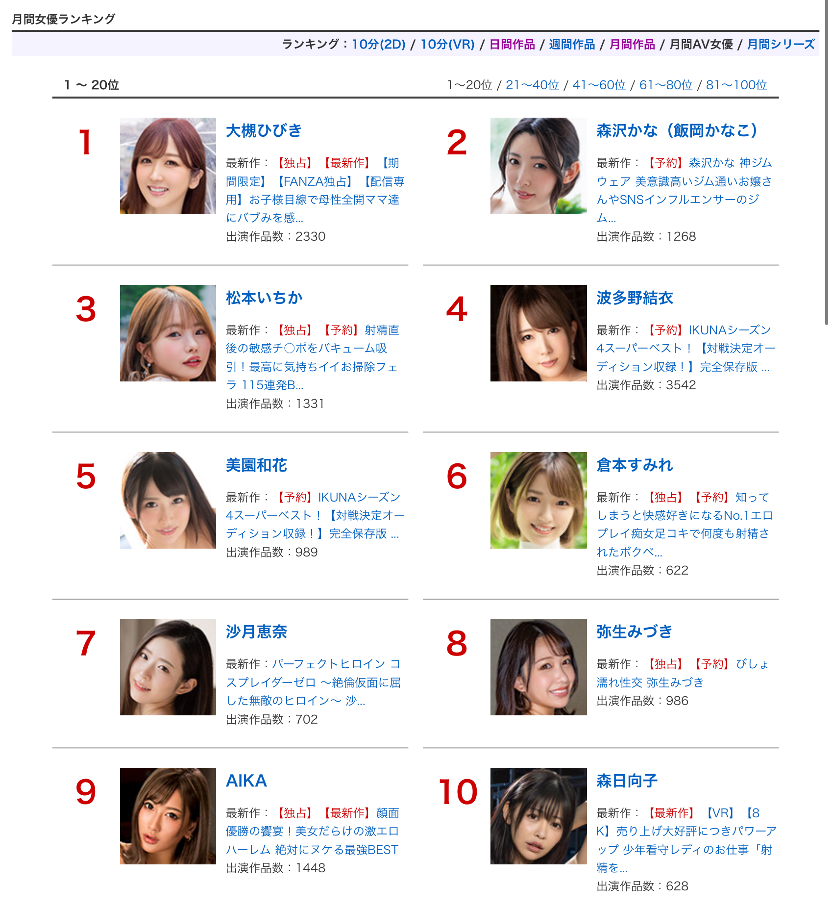 最后,来看总销售量的「AV女优榜」,这个月可以看到的是刚转为企划女优的「宫城りえ(宫城理惠)」表现相当不错,直接打进了第8名,和森沢かな(森泽佳奈)和柏木こなつ(柏木小夏)成为现阶段最好的企划女优,接下来就是要想办法把好成绩维持下去不能是昙花一现;至于串流部门的AV女优排行榜也有了相当不一样的变化,大槻ひびき(大槻响)和森沢かな(森泽佳奈)姜是老的辣分别拿下一二名,长期霸榜的「松本いちか(松本一香)」则是掉到第三,这是短期现象还是松本いちか(松本一香)要就此离开卫冕者宝座,我们可以好好观察〜