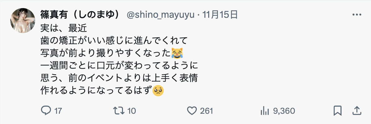 她在X上的推文有说,最近看到很多对自己的评论,不论好坏,都能成为努力的契机;接着她话锋一转,说最近牙齿矫正进展得很顺利,感觉每一周最新都在变化,拍照比以前更容易了,应该可以比之前的活动更能做出好看的表情~
