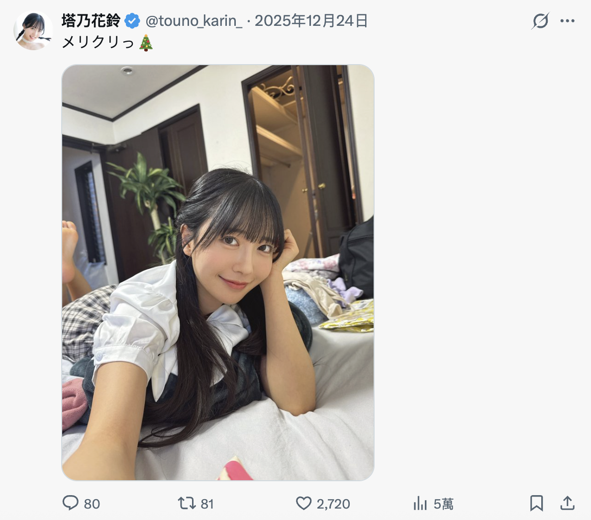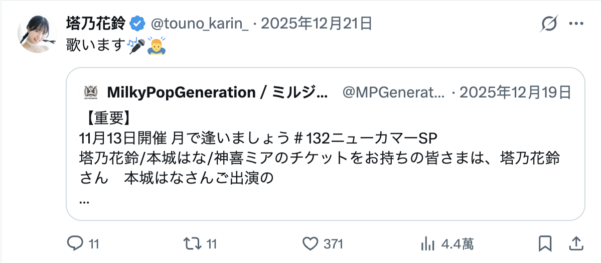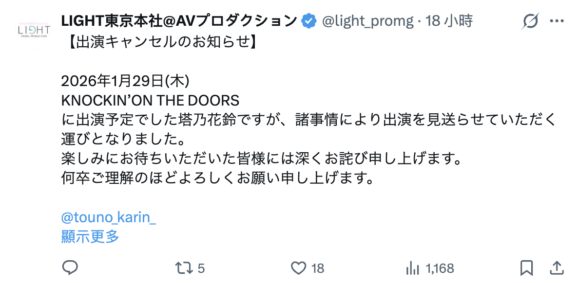 首先,她的X(https://x.com/touno_karin_)发文停留在去年平安夜,也就是说超过一个礼拜没发文了,更不要说之前社群还上锁,对她来说极不寻常;再来,身为片商和经纪公司力捧的新生代女优,塔乃花铃被安排了很多活动,之前有去参加「英语禁止ボウリング」(英语禁止保龄球)的录影,但因为最近自社群上消失所以节目播出时她没有转播制作单位的发文,更奇怪的是原本安排好要在1月29日参加的拼盘演唱会「KNOCKIN' ON THE DOORS」她也辞退了⋯