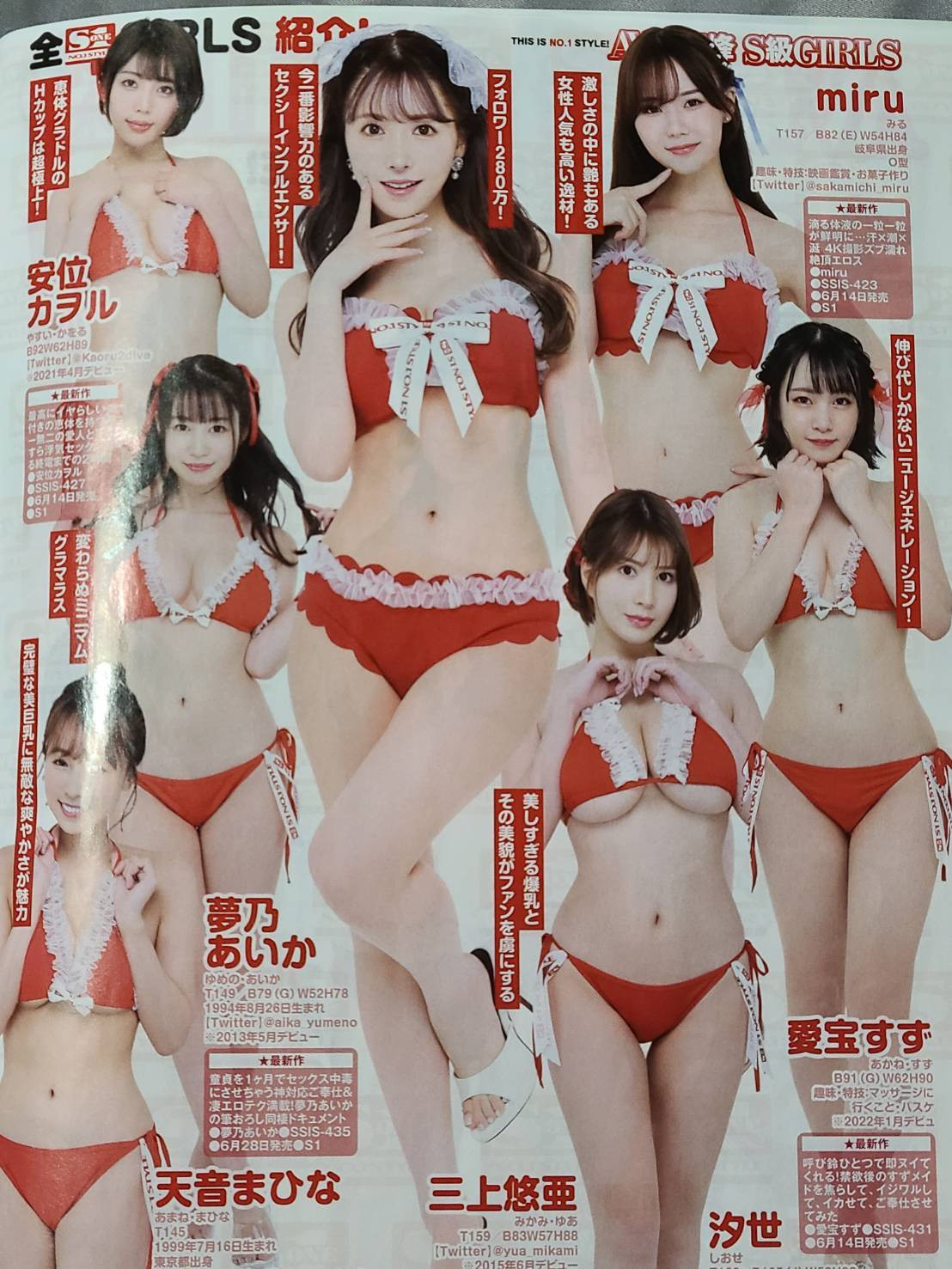 然后呢?第二页的C位自然是三上悠亜啦,然后你会发现左边三位的大小和右边不大一样,你说左边那三位比较不重要吗?也不见得,安位カヲル(安位薰)是Muteki最后一位艺能人女优,梦乃あいか(梦乃爱华)是S1最资深的女优,天音まひな(天音真比奈)则是小宵窜起来前第二档销售最稳定的巨乳小只马;至于右边那三位其中有两人改了名字,miru是业界最知名的战斗机器,汐世(有栖花あか)则是之前安斋不在时片商来的神乳MK-2,至于爱宝すず(爱宝铃)嘛⋯大概就上半年出道作卖最好的新人吧,要不然我实在解释不出为什么她能在第二页占得这么大篇幅⋯
