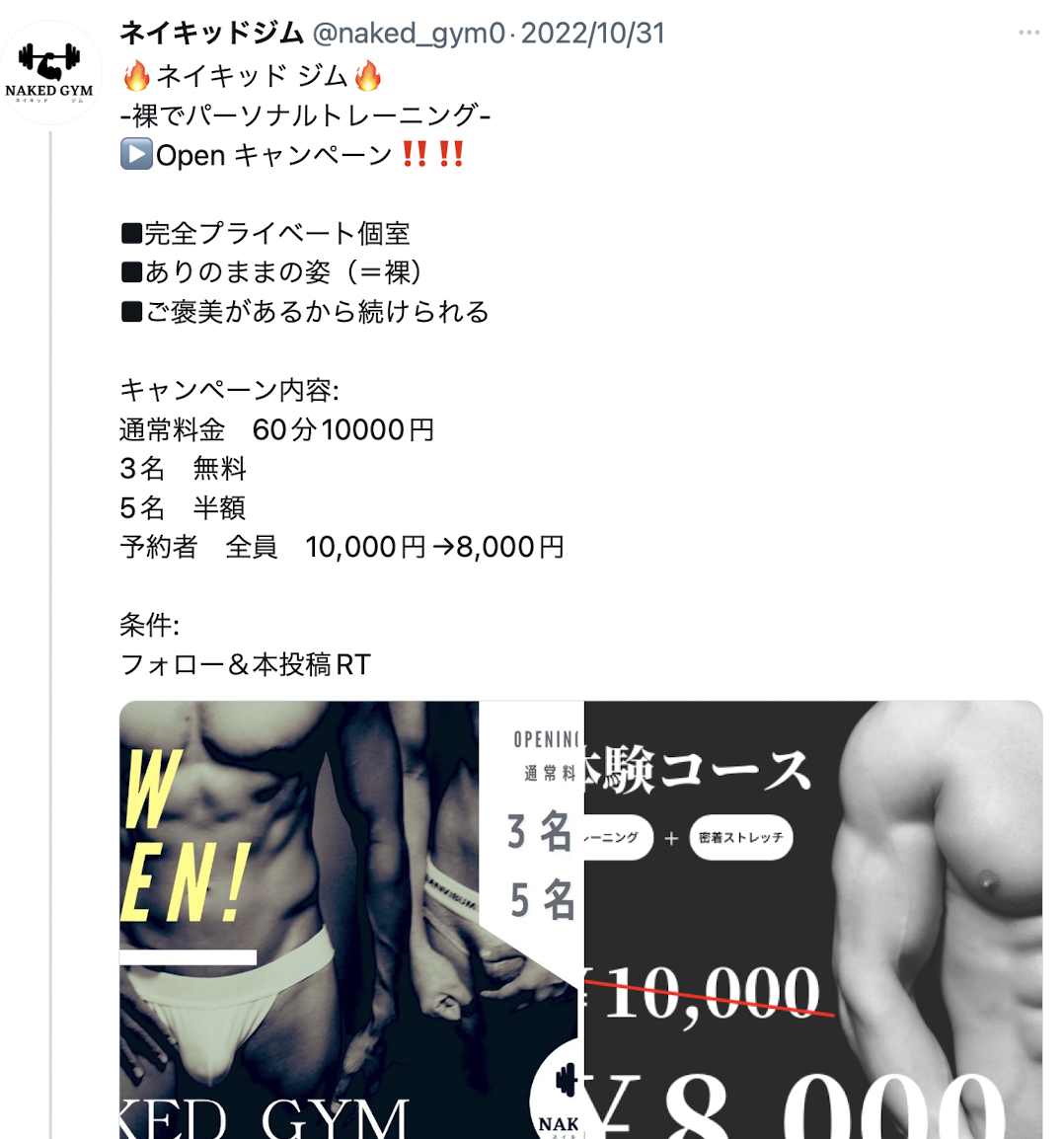原来是有个名为「ネイキッドジム」的团队租借她的健身房招生,这看起来没太大问题,但如果你知道ネイキッド(Naked)是「裸露」的意思就会觉得不太妙,在twitter的招生广告中,可以看到这个团队不只是穿着BVD的子弹内裤教导学员做健身,最后更是一丝不挂,甲味甚浓〜