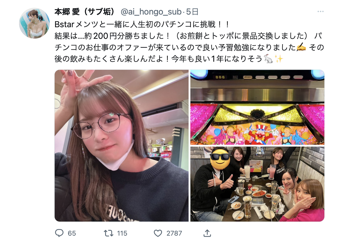 她有一个小号(https://twitter.com/ai_hongo_sub/),去看你就知道那是完全不一样的本乡爱,没有修得漂漂亮亮的写真照,上传的都是手机APP修好的自拍照;另外,和主帐号只会很机械式发罐头留言不同,在小号上的本乡爱讲的才是人话,她会「うおおおお(Uoooo)」的鬼叫、也会TAG事务所社长的帐号,如果发文完你马上就留言的话还可以得到她的讚喔〜
