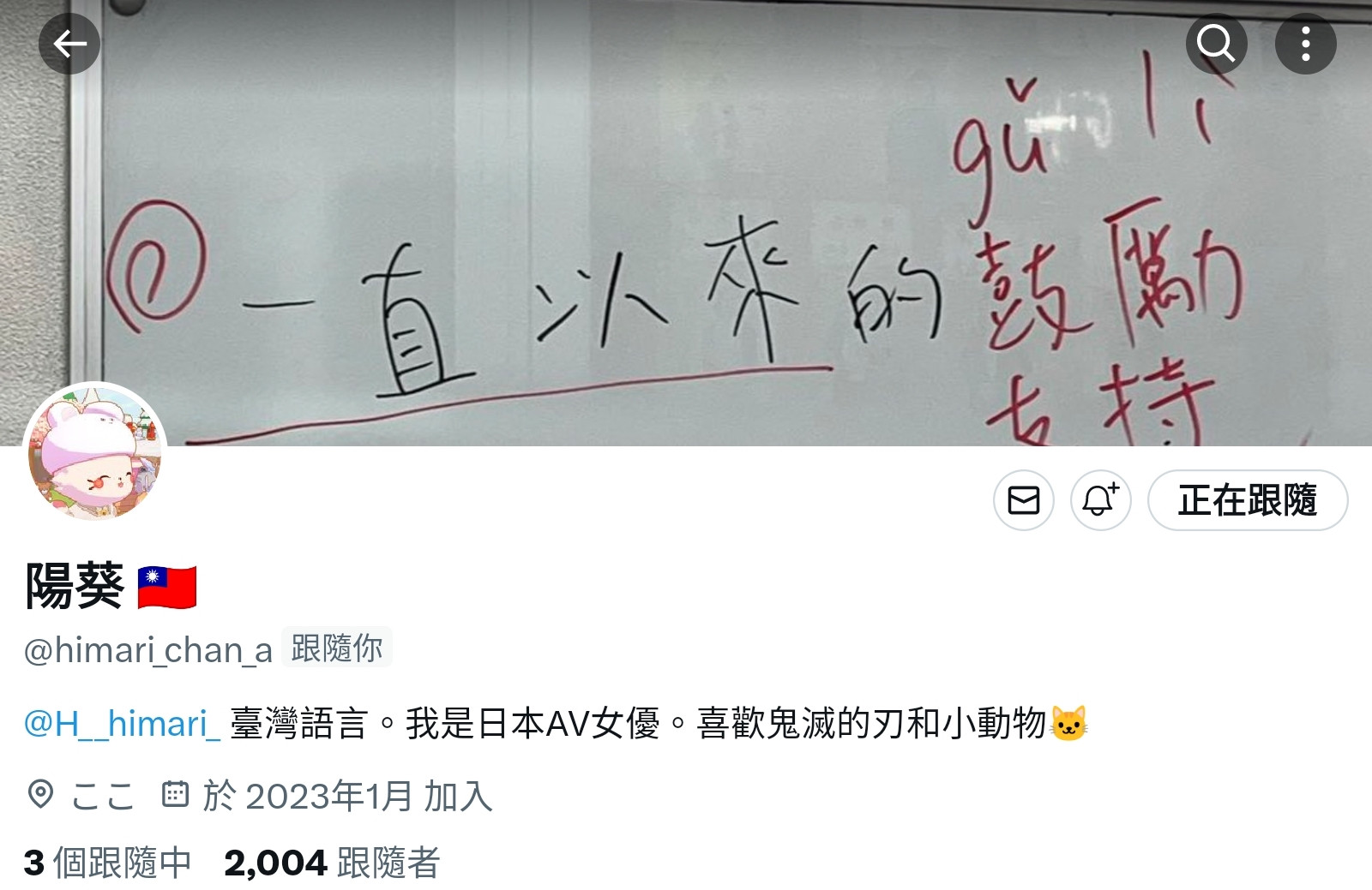 正确来说是日文的那个twitter不见了,她用「阳葵」之名注册、用来学习中文的帐号还在,这实在有点奇怪啊,以她之前热爱经营社群简直就像纠察队的行径来看肯定出了什么事,但如果不玩了又为什么留下中文帐号?她是在盘算什么?