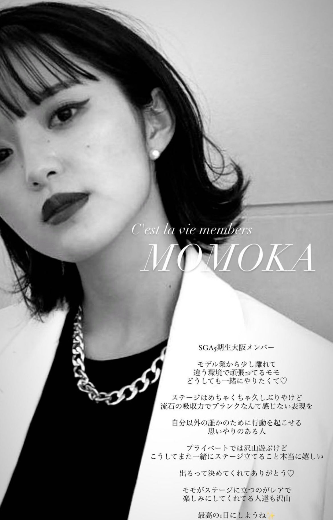 简单介绍一下这位下马人:她是2020年出道的模特儿,最早是在CAMPUS COLLECTION的舞台走秀ー这个活动是大学生为目标、让她们体验企划、运营以及执行的时尚活动,简单说岛田桃华就是个素人麻豆;后来她则是成为SGA5期生的大阪成员,那是一个强调「自然就是美」、让成员推广极淡妆素颜美的企划,就在那个时候,她的社群快速成长,X、IG和Tiktok都有不错的发展⋯