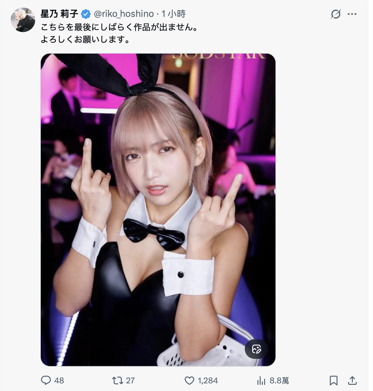 编按:在星乃莉子宣布这是最后一支作品后,SOD的制作人马上留言提醒她说「还有一支会发」,所以这支作品并不是星乃休业前的最后一炮,我先备注在这儿,底下修文。