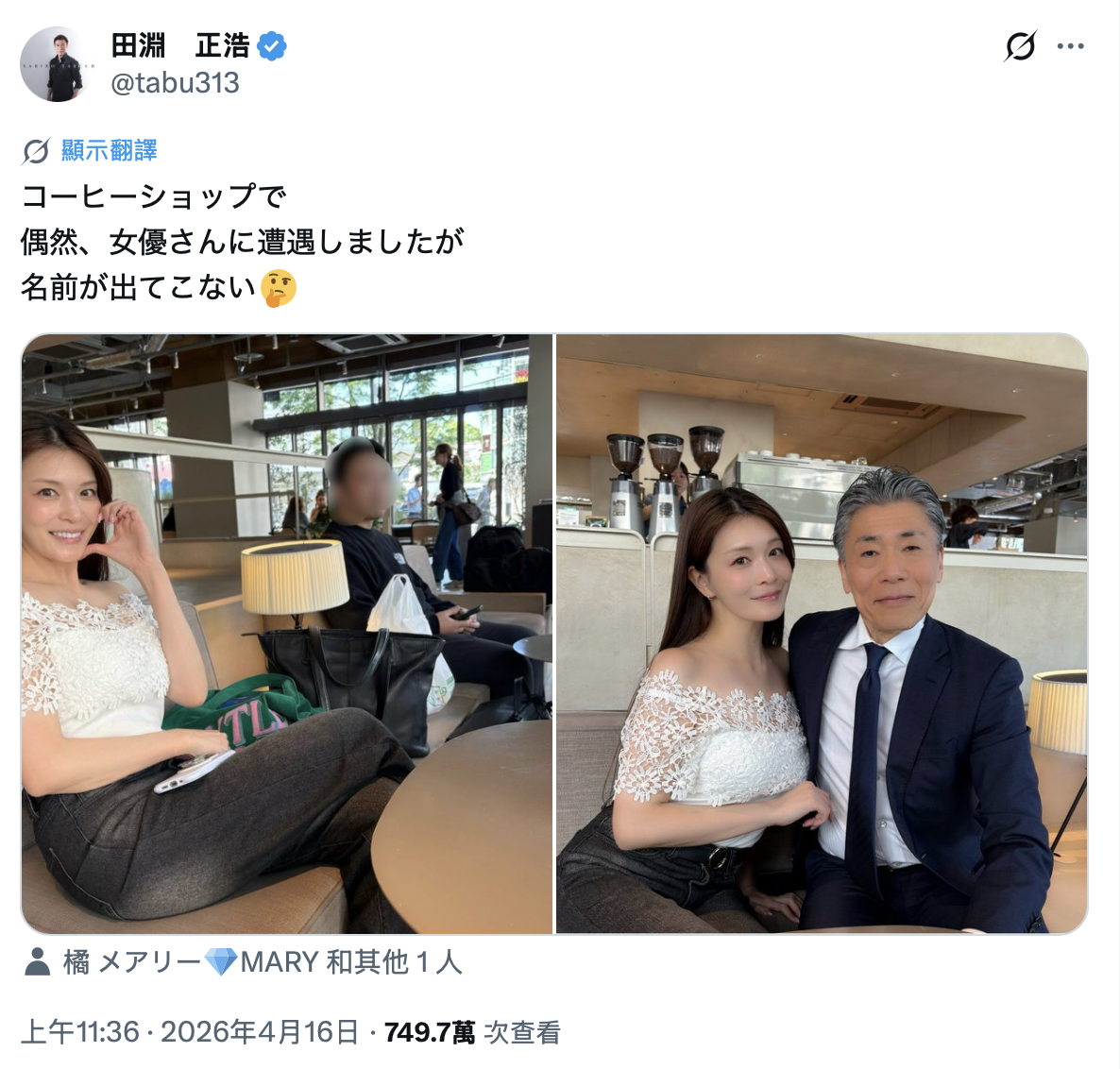 如果真的忘了,那可能要请田渊正浩去吃银杏了;我个人倾向他是故意搞笑,巧遇是真,记不住名字是梗,就是借着这个机会吸引流量;但就算是真的忘了,从他发文后标记橘メアリー(橘玛丽)的帐号应该也是知道对方的名字了⋯